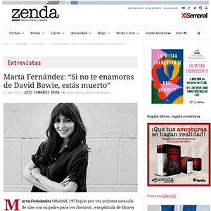 ZendaExtracto del medio de comunicación Marta Fernández: “Si no te enamoras de David Bowie, estás muerto” Marta Fernández (Madrid, 1973) pisó por vez primera una sala de cine con su padre para ver Fantasía, esa película de Disney en la que un T-Rex tridáctilo —en realidad, los tiranosáuridos sólo tenían dos dedos en las patas delanteras— atacaba…