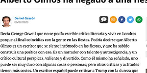 Decía George Orwell que no se podía escribir crítica literaria y vivir en Londres porque al final coincidías con la gente en las fiestas. Podría decirse que Alberto Olmos es un escritor que se siente incómodo en las fiestas, y que ha sabido construir una poética con eso. Es un narrador con talento y autoexigencia, y un crítico cultural perspicaz, valiente y divertido. Como él mismo ha señalado, uno puede ser muy duro con algunas cosas o personas; pero otras críticas y actitudes tienen más costes. Un escritor español puede criticar a Trump con la dureza que merece sin arriesgar nada; otra cosa es meterse con un concejal o cuestionar un marco supuestamente de izquierdas. La mayoría de la veces no hace falta decirlo: lo ves. Cuando hay un consenso, una nueva causa de moda, muchos héroes corren en auxilio del vencedor; otros callan, disimulan o hacen fintas. En cambio, Olmos se lanza contra el consenso. Tiene un método basado en la lucidez, el descaro y en que no le importa resultar antipático. (El peligro, que logra evitar, es que la antipatía puede convertirse en otra coquetería.) Sabe combatir las ideas recibidas: puede desmontarlas con cálculos sencillos. Es lo que hacía en su blog y lo que lleva un tiempo haciendo en las columnas que escribe sobre libros y cultura en el periódico El Confidencial, ahora reunidas en Cuando el VIPS era la mejor librería de la ciudad (Círculo de Tiza).